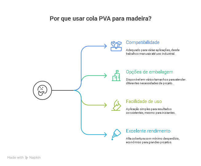 Essas especificações tornam a cola PVA uma das soluções mais versáteis e econômicas do mercado, especialmente para quem procura colar madeira com qualidade e eficiência.